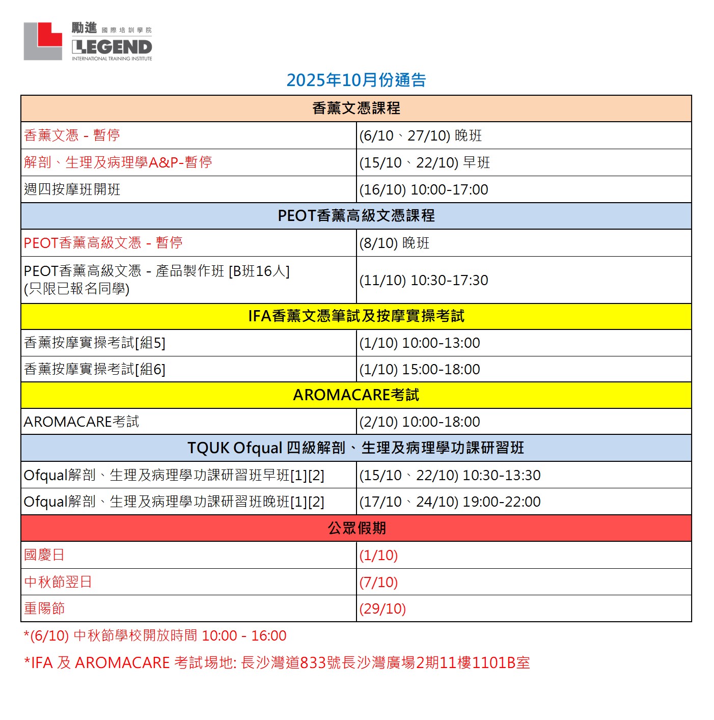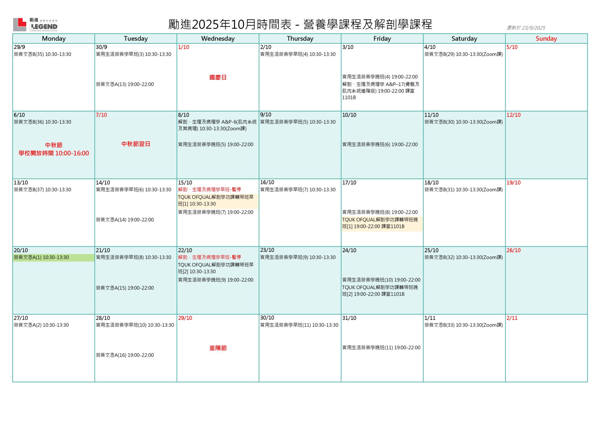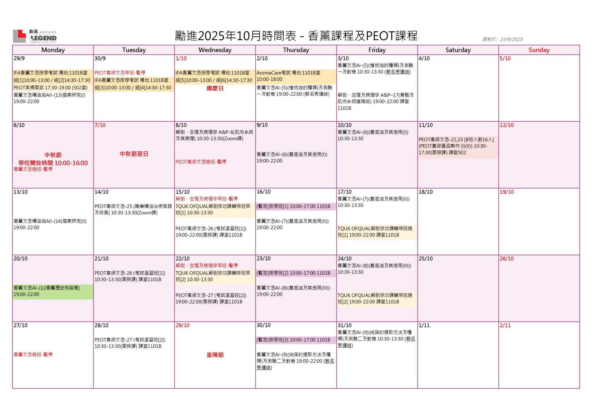2025年10月份時間表